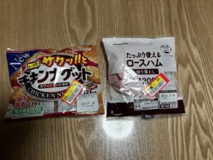 普段チキンナゲットは買わないのに黄色いシールの158円に惹かれた。ハム154円は賞味期限あと1日。ひとり暮らしで数日のうちに200g食べるのは大変じゃん。