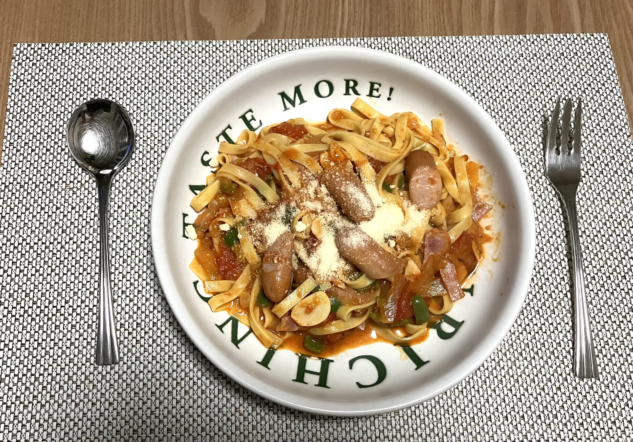 冷凍してあった我が家のミニトマトを取り出し、残ってたフィットチーネでイタリアン。