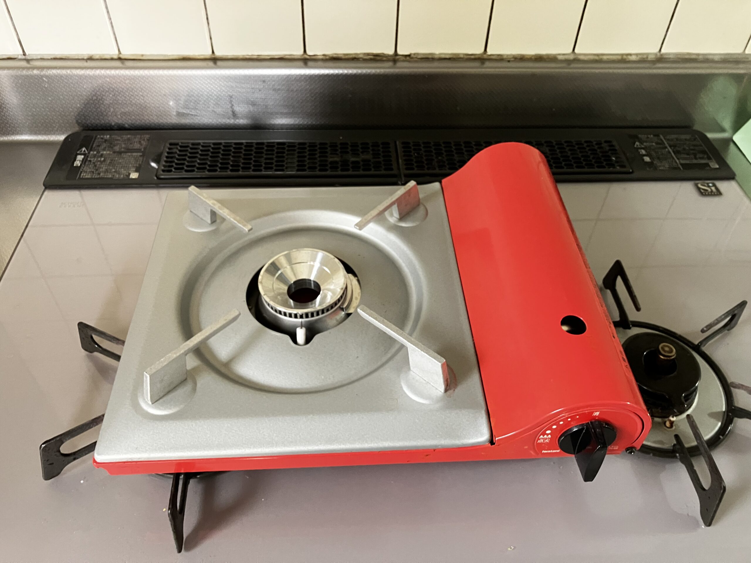 換気扇が無いと困るのでこんな感じでコンロの上にコンロ。