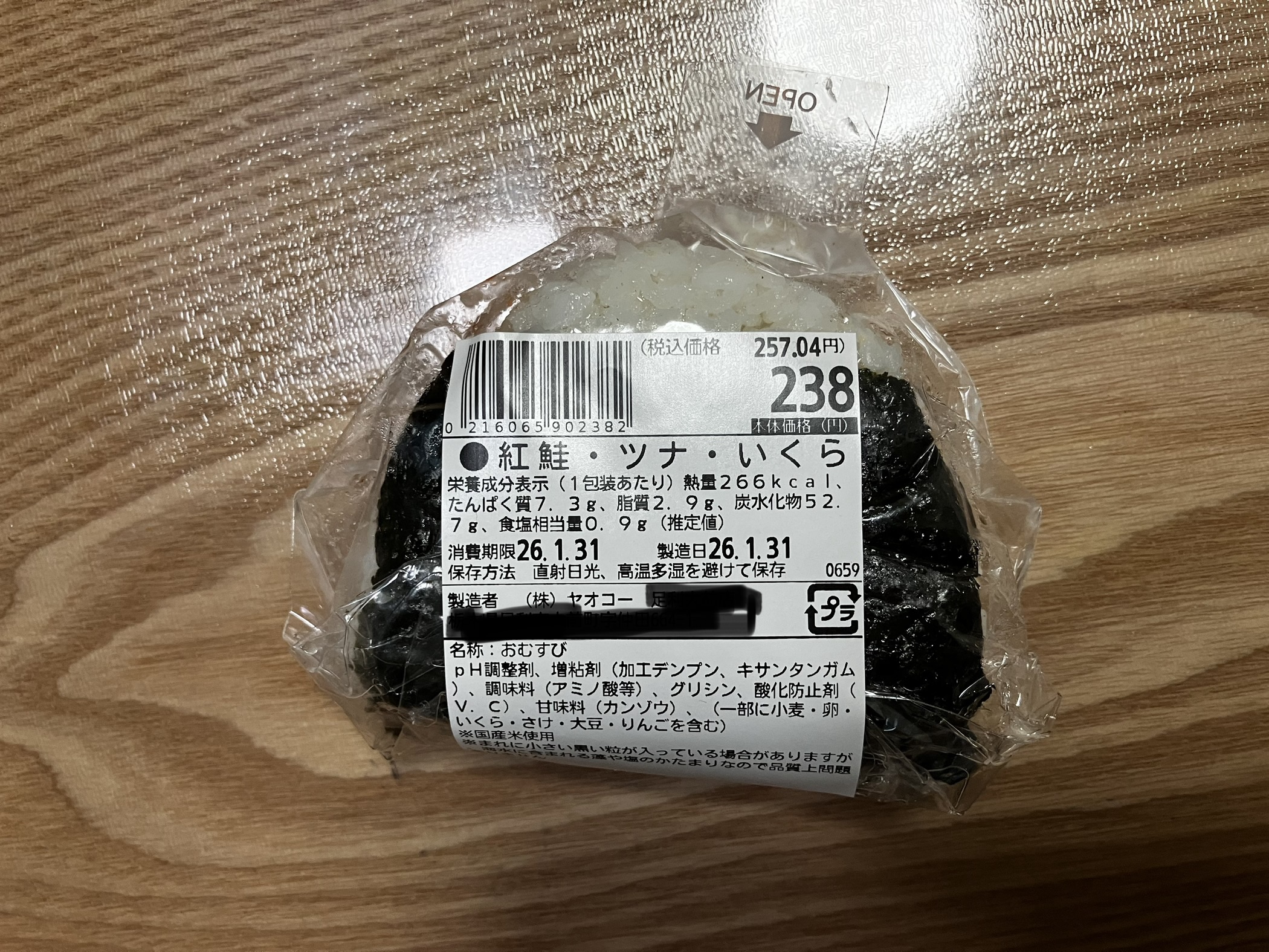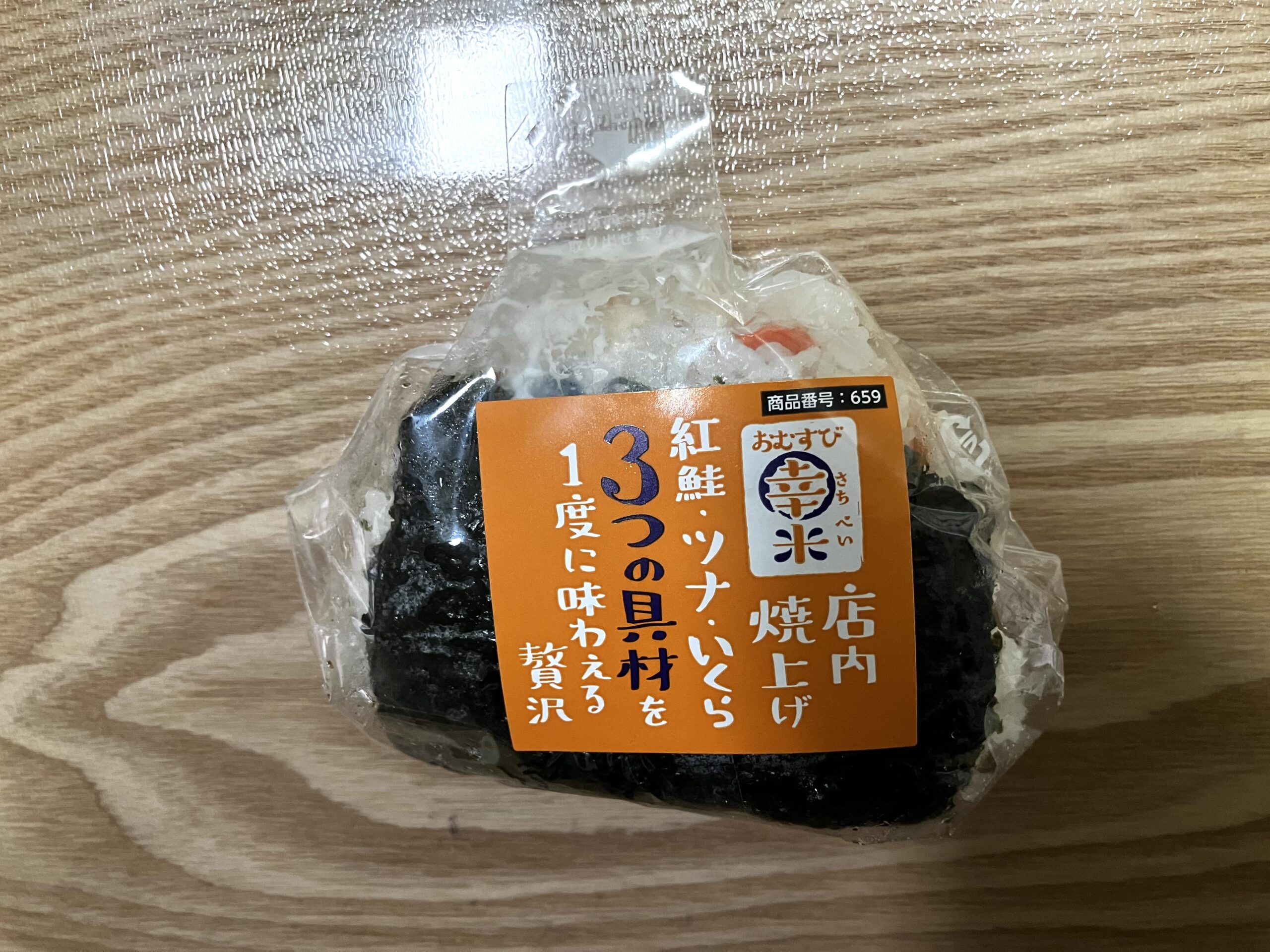最初は「明太子・高菜」を買おうと思ったけど、3つの具材に変更。で、「紅鮭・ツナ・たらこ」って。