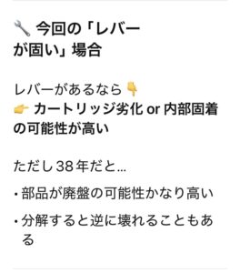 帰った後、最近覚えたチャットGPTに「38年前の水栓のレバーが固い。どうしたらいい?」と聞いてみた。